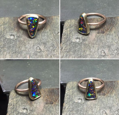Bright Green and Bright Blue Triangle Shaped Queensland Boulder Opal Ring. Set in a 14ct Yellow Gold Brushed Finished Bezel Setting on a 9ct Rose Gold Brushed Finished Band.