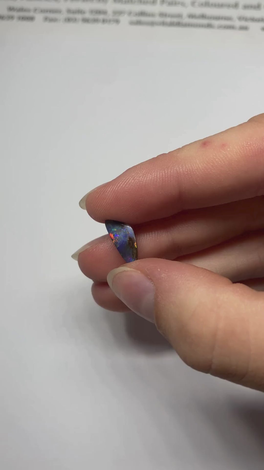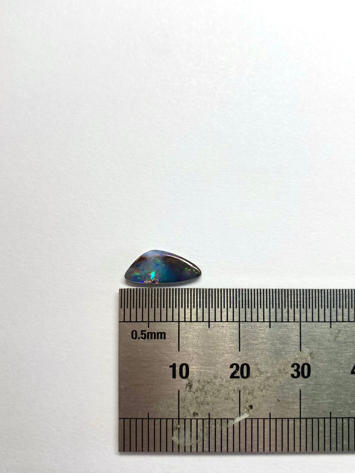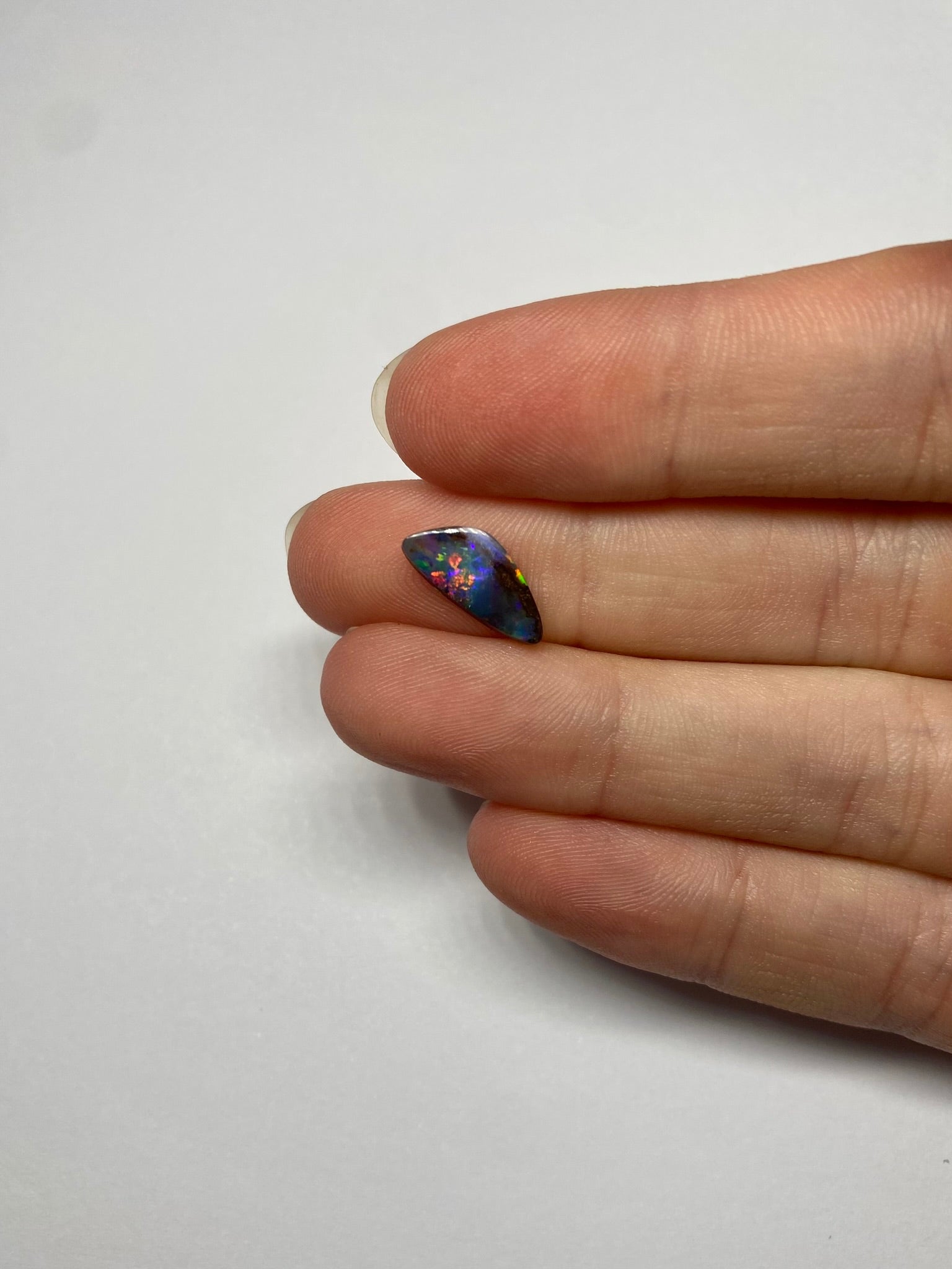 Experience an intergalactic dream with this stunning natural opal. Its striking deep blue, green, and purple colors, with hints of vibrant rainbows in the light, will transport you out of this world. The unique triangular shape and small fragments of ironstone showing through make this opal truly one-of-a-kind.