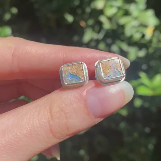 The vibrant green in the opals sparkle like shafts of light through a mossy canopy in these lustrous stud earrings, each stone rich with earthy ironstone that gives them depth and character. Set in classic sterling silver bezels, the Enchanted Grove studs bring a whisper of woodland magic and shimmering colour to every day or special occasion.