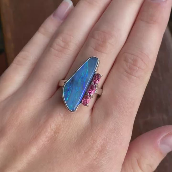 Embark on a voyage of a lifetime with a ring that captures the glorious evening colours of a sunset over the ocean. The sleek natural opal boasts a display of rich blues which are complimented by the vibrancy of the three pink tourmalines that sit elegantly adjacent to the opal. Tied together with a silver setting, this ring is perfect for elevating a special look.
