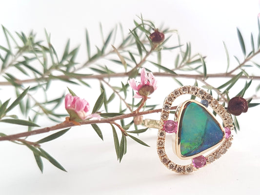 MISE À JOUR : Opale du Queensland, diamant et saphir rose et bleu | Bague Or Jaune 9 Carats