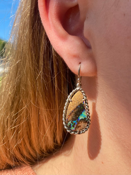 Boucles d'oreilles en opale boulder avec une torsade en argent