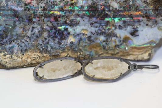 Boucles d'Oreilles Pendantes Géode Agate Argent Oxydé