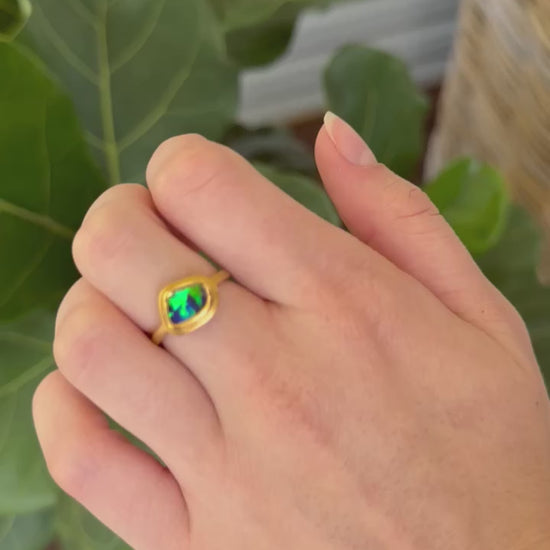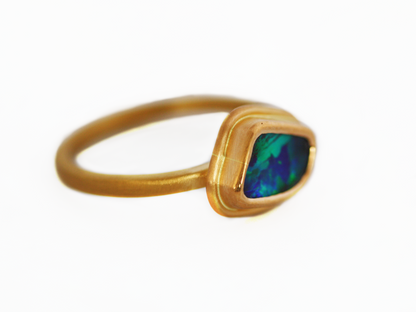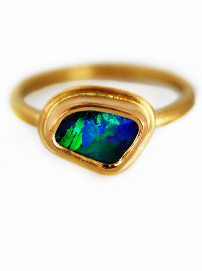 Cette superbe opale boulder bleue du Queensland a tant de couleurs vertes vibrantes qui éclatent à travers l'opale bleue, lui donnant cet éclat fascinant. Cette opale est sertie d'or 22 carats, créant une bague simple mais élégante.