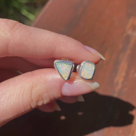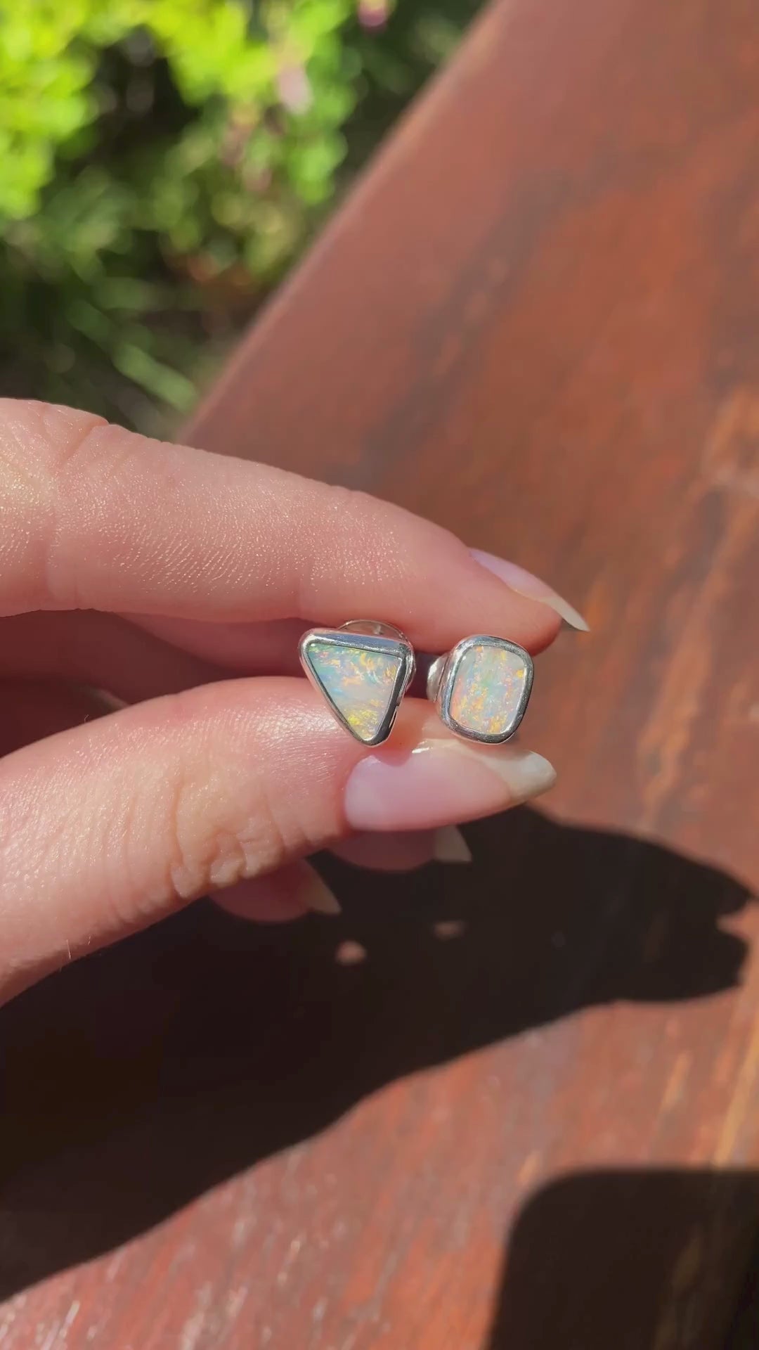 These Geometric Spectrum studs capture a fragmented rainbow within their depths, mirroring the untamed vibrancy of the Australian earth. This handmade pair of earrings features an asymmetrical look with a sharp, architectural triangle against the soft, organic lines of a rounded rectangle to celebrate a sophisticated, alternative beauty. The natural opals radiate a shimmering play-of-colour that shifts with every movement, elevating you everyday style. Secured within protective sterling silver bezel settings, these one-of-a-kind treasures highlight the meticulous human touch and artisanal precision behind every piece.