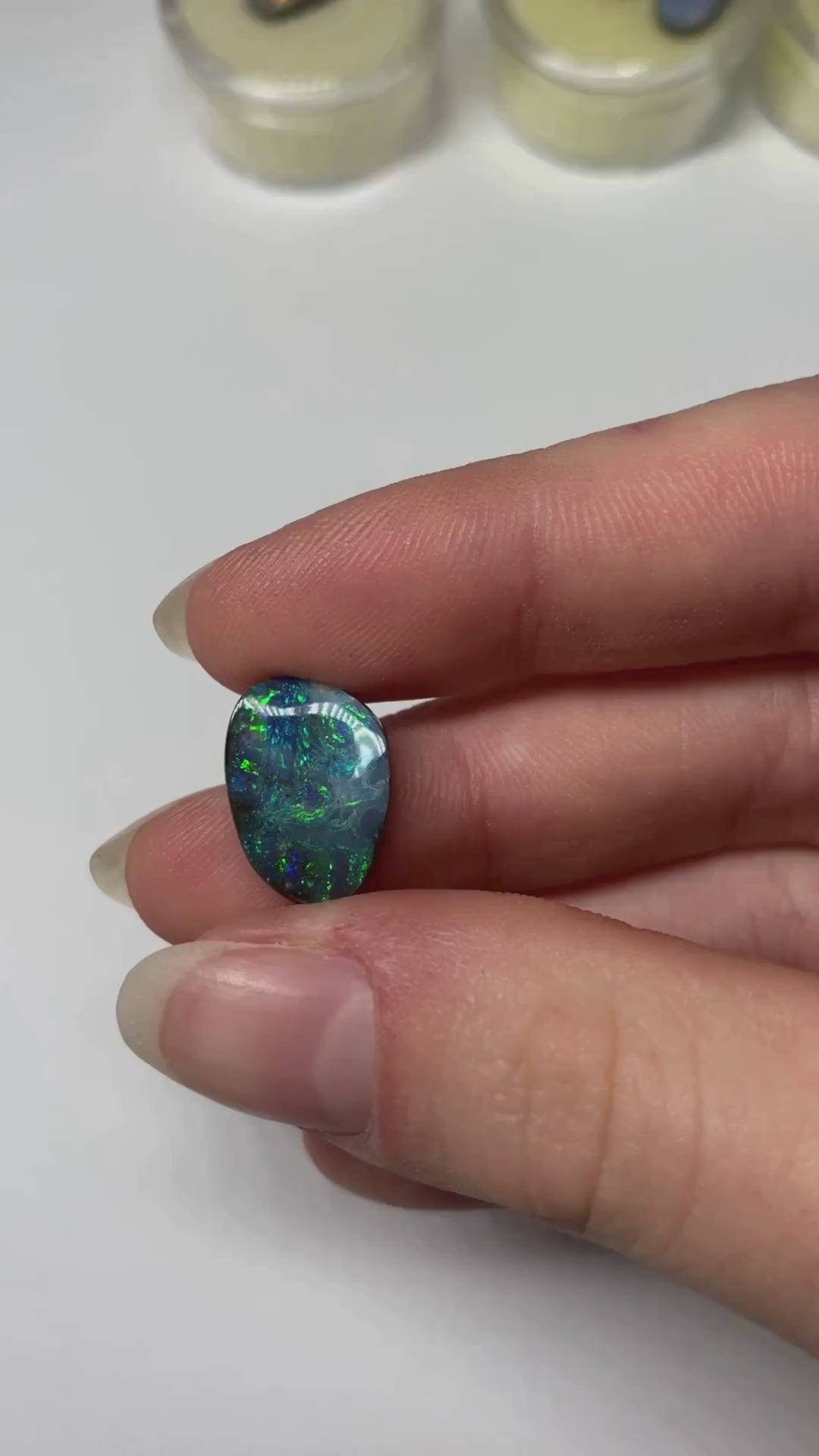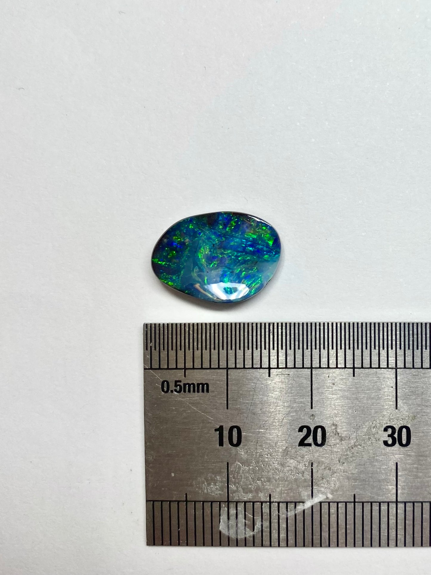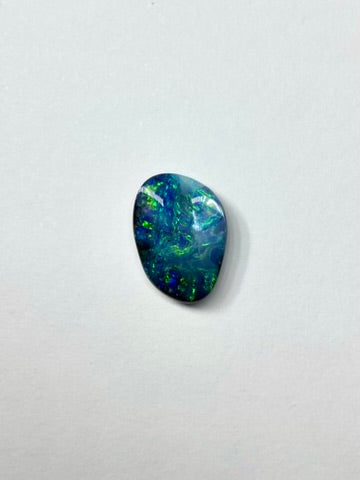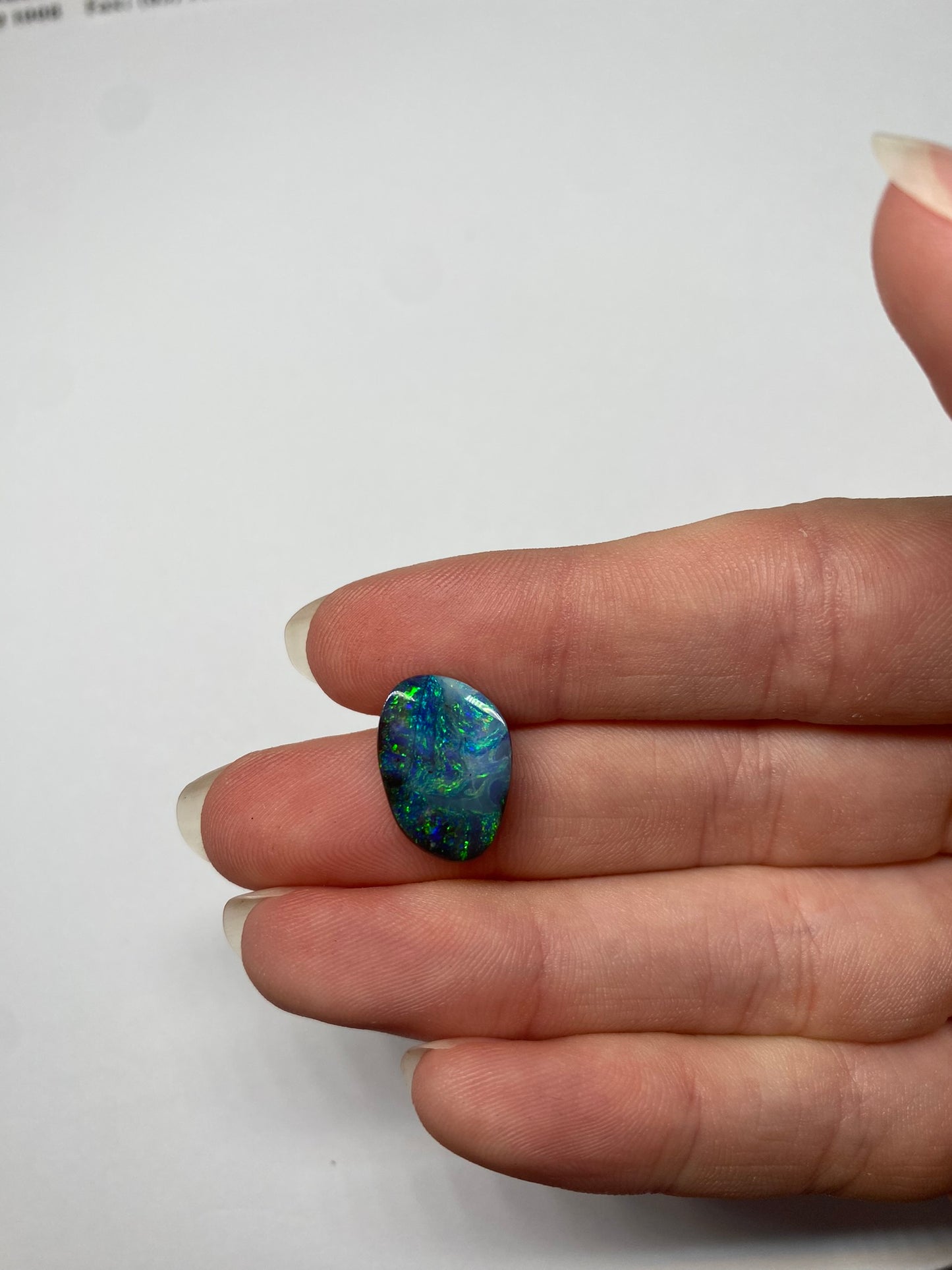 This opal is a stunning combination of dazzling green and blues. Its organic round shape is complemented by a captivating green glow, a true display of natural gemstone beauty.