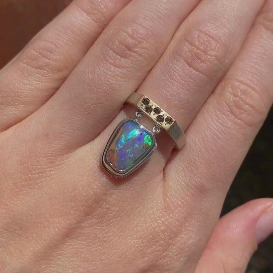 This exquisite statement piece captures the elegance of a butterfly in mid-flight, brought to life through the vibrant soul of a natural Australian pipe opal. Handmade with meticulous care, the opal dangles with a playful fluidity and shimmering play-of-colour in deep blues, electric greens, and ethereal purples that mimicks the delicate flutter of wings. The cool lustre of the sterling silver band provides a sophisticated contrast to the warm rose gold feature, which is set with five natural champagne diamonds that catch the light with every movement. This is a one-of-a-kind, handmade treasure that celebrates nature’s artistry that any fine jewellery lover can celebrate with this statement ring.