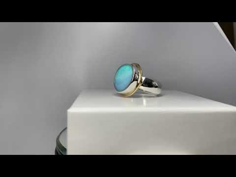 The vibrant aqua and turquoise blues in this Queensland Boulder Opal Ring jump from the ring to catch any light passing. A sparkling aqua flash makes its way across the centre of this round solid opal, such a beautiful shape and really the perfect size to wear every day and make an impact. This ring is handmade in silver with an 18ct Yellow Gold accent, the style is clean and classic to go with all styles.