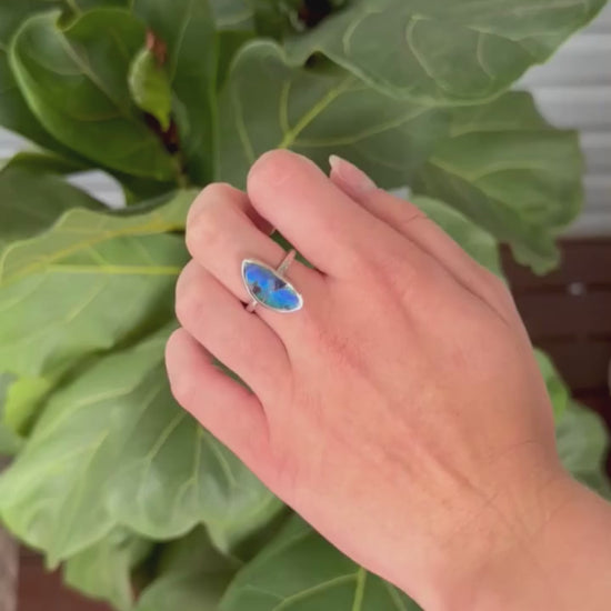 This magnificent boulder opal has many deep blues and greens, resembling a galaxy. The deep colours and unique shape make this ring so special and one of a kind. The blue boulder opal is set in a silver band.