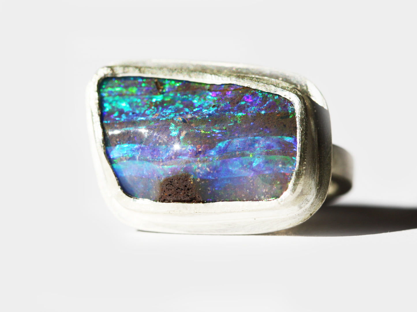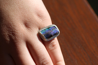 Handmade Queensland Boulder Opal silver statement ring. So many beautiful colours in this ring! Start your journey with unique Australian stones here with this high quality one of a kind piece.