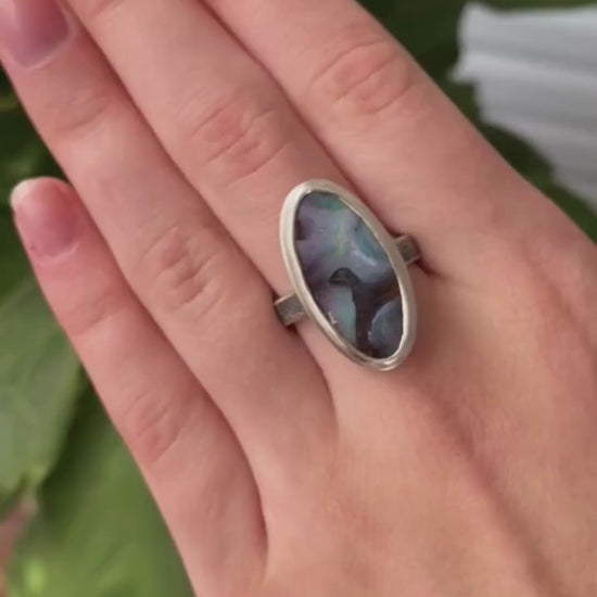 Inspired by the mesmerising beauty of the galaxy, this handmade Queensland Boulder Opal ring captures a nebula's swirling green and pink clouds. Set in silver, the opal's vibrant colours shift and glow with an otherworldly radiance, evoking the dynamic beauty of the cosmos. The opal displays a myriad of blues and purples with the ironstone inclusions forming the silhouette of a dog. The silver band adds depth, highlighting the opal's stunning colours.