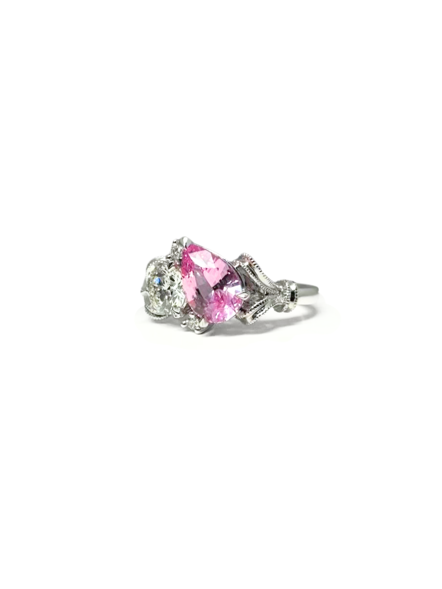 This custom design featured a pear shaped sapphire and a round diamond. The band as embellished with detailed flourishes with milgrain detailing.