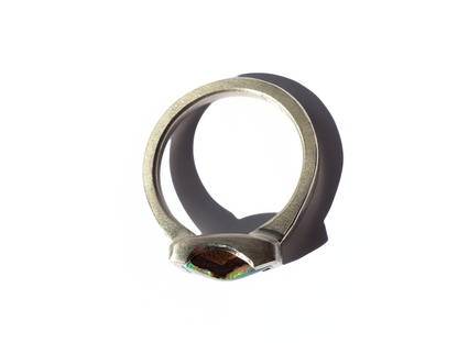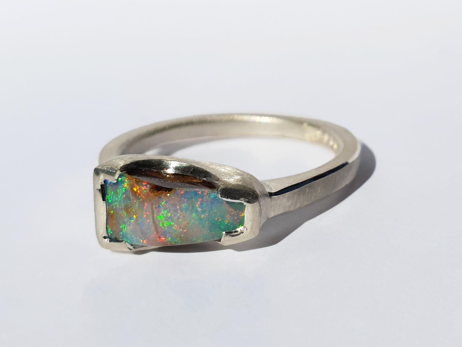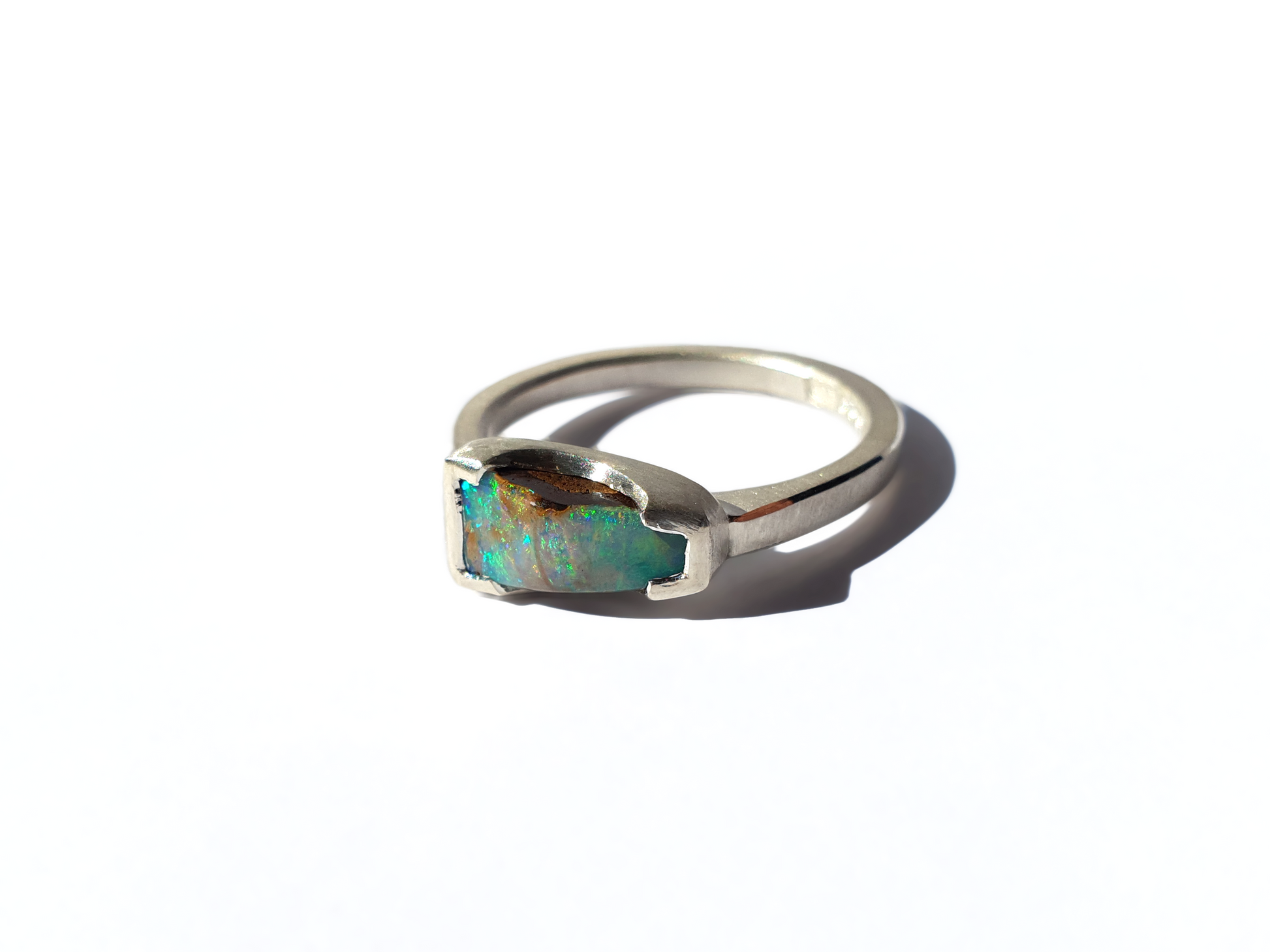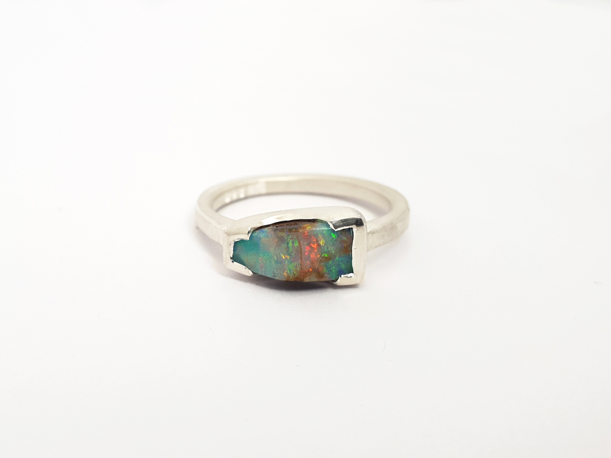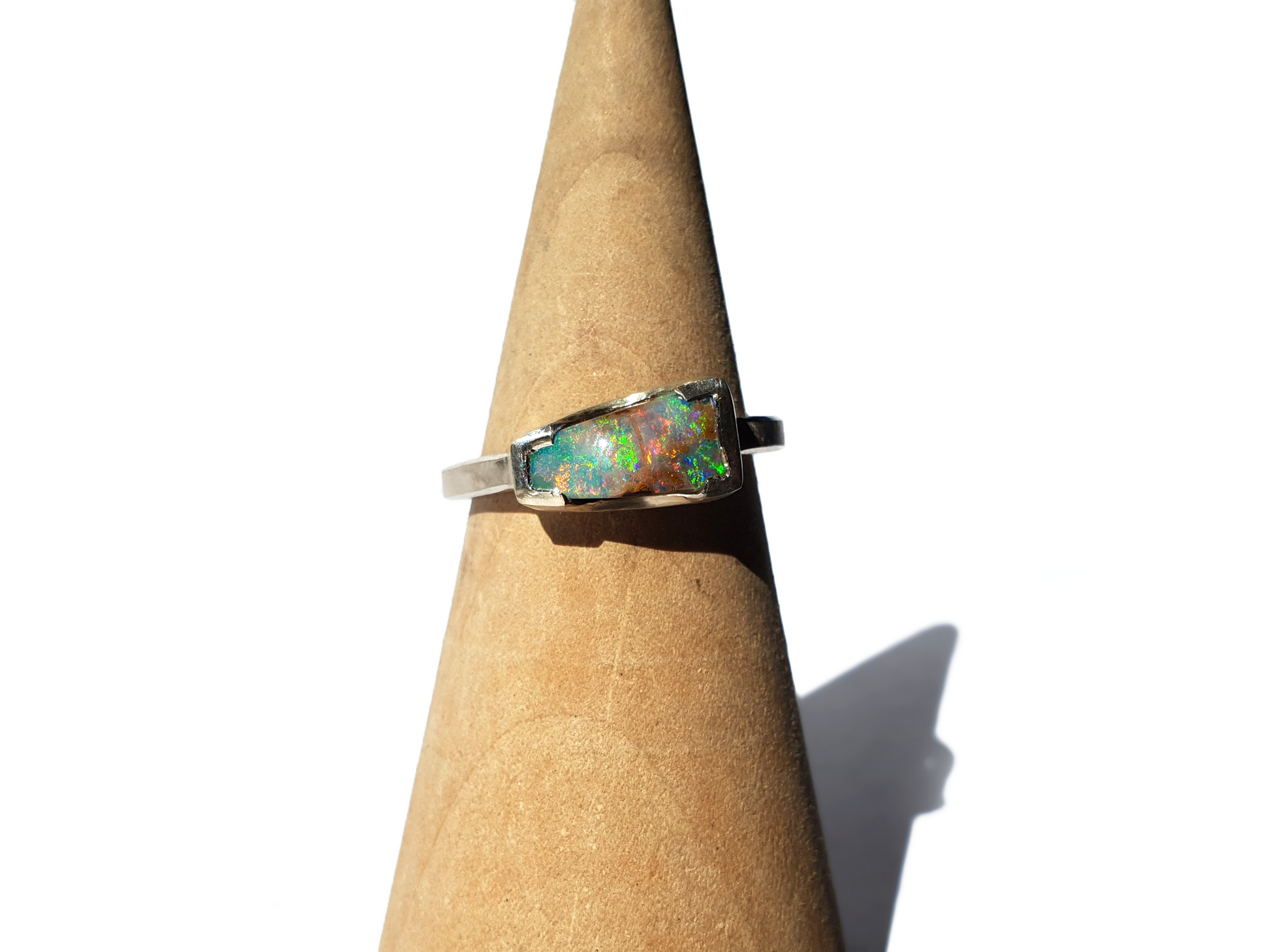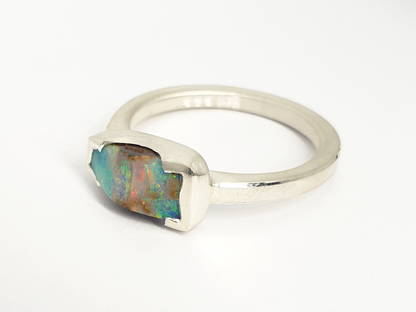 A bright flash of colour falls across this beautiful peaked opal ring. Handmade and set in silver we selected this opal for its unique shape and bright flash while still showing its ironstone roots as a solid boulder opal. Love it!